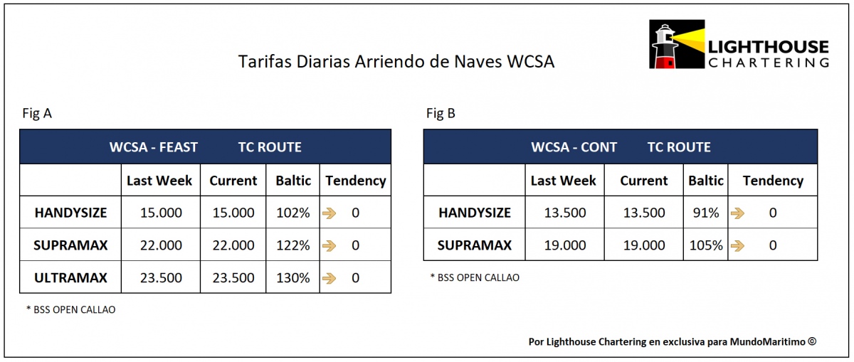 En la ruta Costa Oeste de Sudamérica (Callao)-Norte de Europa (Fig.B) el arriendo de buques Handysize alcanzó los US$13.500/día, equivalentes al 91% de la tarifa de referencia BHS, conservando su valor respecto a la semana 46. Mientras que el de naves Supramax alcanzó los US$19.000/día, equivalentes al 105% del segmento de referencia BSI, manteniendo su valor en respecto a la semana anterior.