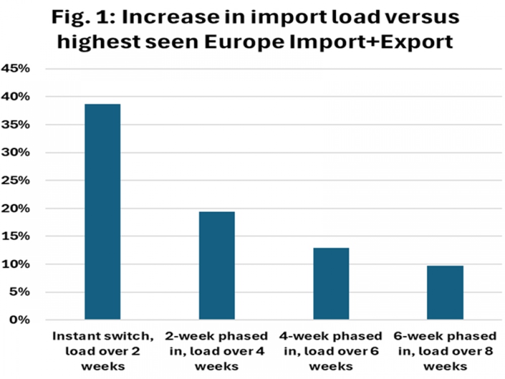 El estudio también modela el efecto sobre las importaciones europeas bajo distintos escenarios, desde una reanudación instantánea hasta una transición gradual en 2, 4 o 6 semanas. Los resultados muestran que un cambio inmediato “acortaría drásticamente las cadenas de suministro, provocando una duplicación temporal de arribos desde Asia durante dos semanas”, lo que se traduciría en un aumento del 39% en el volumen total de carga manejada en los puertos europeos, en comparación con el máximo histórico previo.