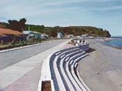 Es el caso de la construcción del muro de defensa costero en Huelden, en la costa norte de la bahía de Linao, comuna de Ancud, que permitió proteger el borde costero en el cual se emplaza la escuela del poblado. Estas obras, no sólo fueron pensadas para resguardar a los habitantes de las altas mareas, sino que también permitió generar una explanada, que dotada de bancas y jardineras, constituye hoy un paseo peatonal. A partir del muro, también fue posible conformar una calle con superficie de material estabilizado y aceras de hormigón, permitiendo el acceso de vehículos hasta una rampa construida por la DOP para facilitar la transferencia de carga a los pescadores artesanales de la localidad. Cabe señalar, que antes de esta calle el tránsito hacia la rampa era sólo una huella a lo largo de la playa.