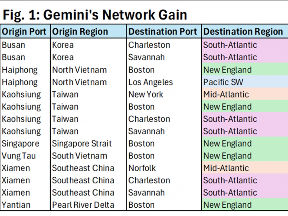 La operación otorgaría a Gemini “acceso directo exclusivo a la región de destino de Nueva Inglaterra (Boston), que está completamente ausente en la red actual de Gemini”. Además, reforzaría la conectividad directa hacia gateways clave del Atlántico Sur estadounidense, como Charleston y Savannah, conectándolos con cinco grandes orígenes asiáticos, incluidos Vietnam, el Estrecho de Singapur y Taiwán.