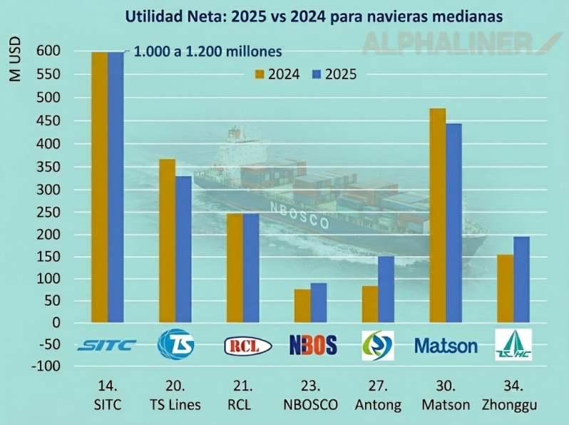 16 de Abril de 2026 Líneas navieras medianas superan a grandes operadores en utilidades durante 2025 El dinamismo del comercio intra-Asia y la escasez de capacidad impulsaron sus ingresos operativos y netos