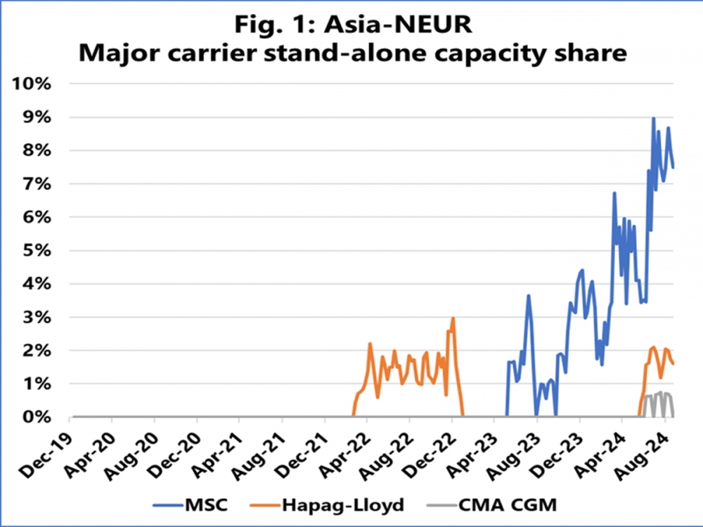 La figura abajo muestra la proporción de capacidad de Asia - norte de Europa (promedio de 3 semanas) ofrecida por MSC en sus servicios independientes, frente a las de Hapag-Lloyd y CMA CGM, que son los únicos otros grandes operadores en la ruta marítima con servicios de este tipo.