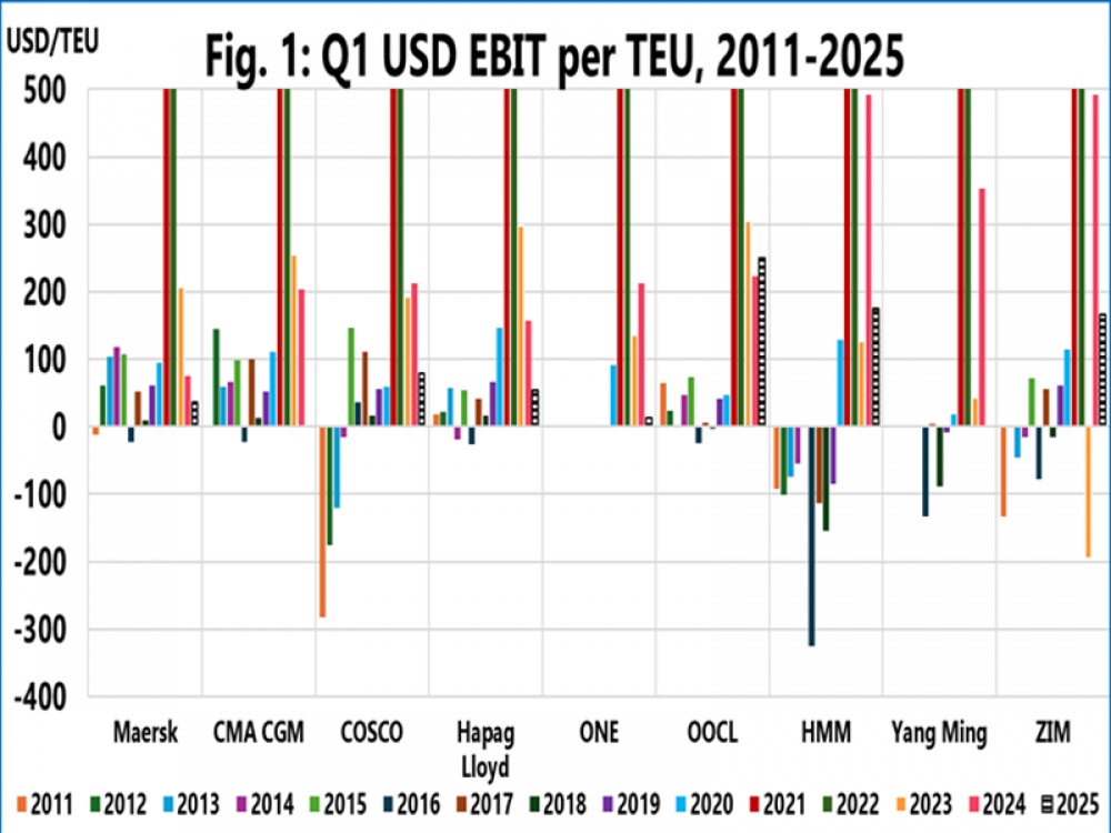 En el primer trimestre de 2025, pese a la incertidumbre del mercado y un inestable clima geopolítico, las principales navieras registraron un EBIT combinado de US$5.890 millones, cifra solo inferior a la alcanzada en los primeros trimestres del período marcado por la pandemia 2021-2023, reporta Sea-Intelligence
