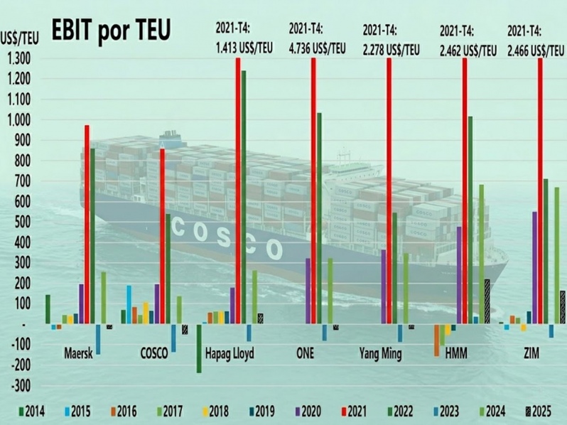 El resto de las líneas navieras reportó pérdidas operativas por cada contenedor movilizado. Cosco presentó el peor desempeño con un EBIT de US$-47/TEU, mientras que ONE (-US$26/TEU), Maersk (-US$23/TEU) y Yang Ming (-US$21/TEU) mostraron resultados negativos similares, evidenciando una convergencia en la falta de rentabilidad unitaria.