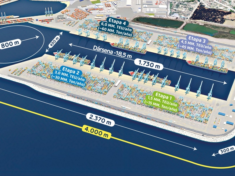 El proyecto se desarrollará gradualmente en cuatro etapas, de acuerdo con la proyección de demanda y, en plena operación, tendrá una capacidad para transferir 6 millones de TEU al año (equivalentes a cerca de 60 millones de toneladas de carga), y podrá recibir, en forma simultánea, hasta ocho buques de 400 metros de largo, los de mayor tamaño que hoy navegan en el mundo.