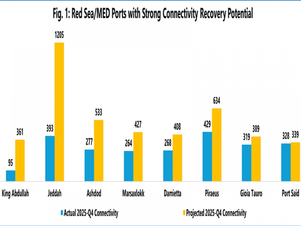La disparidad es marcada. En el Mar Rojo, King Abdullah Port registra hoy un índice de conectividad de 94,7, muy por debajo del valor proyectado de 361,5. Esto implica un potencial de recuperación de 282%. “Jeddah muestra una dinámica similar, con una brecha del 206%”, señala el informe. Esta misma supresión se extiende al Mediterráneo Oriental: Ashdod se sitúa 92,4% por debajo de su proyección, mientras que Damietta presenta un rezago superior al 50%.