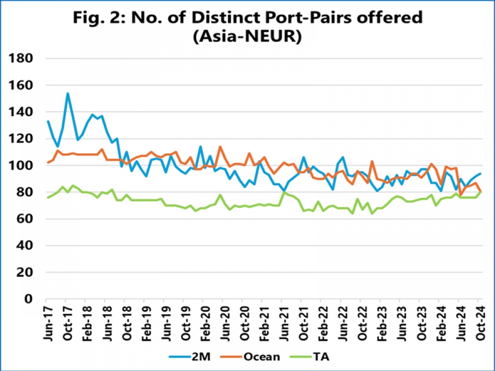 En Asia-NEUR, al comienzo del período analizado, había una clara diferencia en las estrategias. Sin embargo, en los últimos meses, esa diferencia se ha erosionado más o menos, y las tres alianzas navieras ofrecen pares de puertos dentro de un rango mucho más estrecho.
