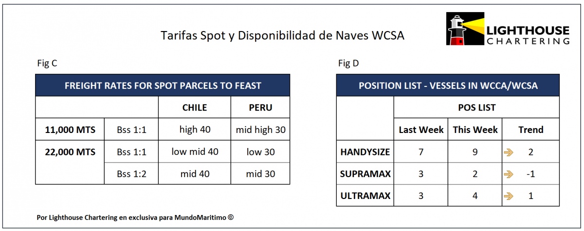 Cabe recordar que los datos de este informe estadístico fueron elaborados por el departamento de investigación de Lighthouse Chartering, que MundoMaritimo difunde semanalmente como parte de una alianza exclusiva. Puede contactarnos para informes especializados con información estadística detallada y actualizada sobre el desempeño de las tarifas de transporte marítimo de graneles a la Costa Oeste de Sudamérica. Principales antecedentes en [email protected].
