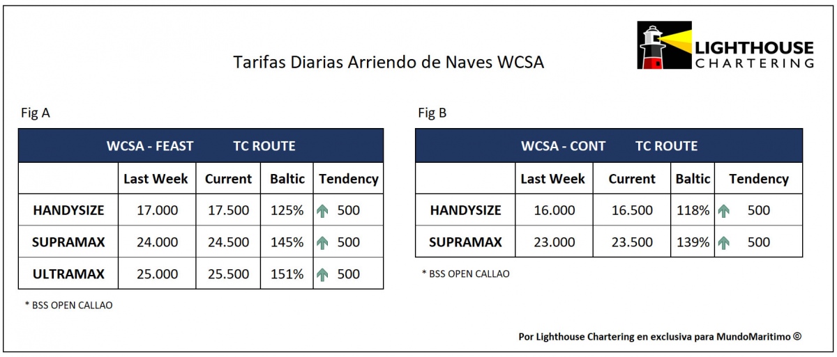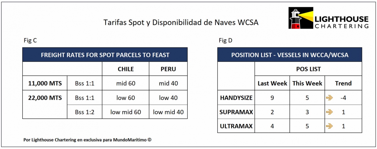 Cabe recordar que los datos de este informe estadístico fueron elaborados por el departamento de investigación de Lighthouse Chartering, que MundoMaritimo difunde semanalmente como parte de una alianza exclusiva. Puede contactarnos para informes especializados con información estadística detallada y actualizada sobre el desempeño de las tarifas de transporte marítimo de graneles a la Costa Oeste de Sudamérica. Principales antecedentes en [email protected].