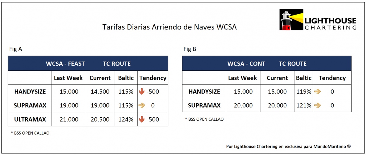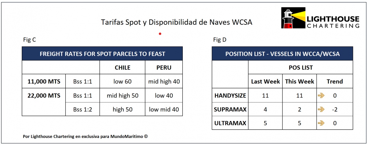 Cabe recordar que los datos de este informe estadístico fueron elaborados por el departamento de investigación de Lighthouse Chartering, que MundoMaritimo difunde semanalmente como parte de una alianza exclusiva. Puede contactarnos para informes especializados con información estadística detallada y actualizada sobre el desempeño de las tarifas de transporte marítimo de graneles a la Costa Oeste de Sudamérica. Principales antecedentes en [email protected].