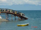 Con condiciones climáticas de excepción, fué botado al mar por la grada de lanzamiento que se construyó en la caleta de Pichi- Pelluco, lo que permitió realizar la faena sin contratiempos, salvo el accidente menor sufrido por tres operarios en la parte de tierra de la faena, producto del corte de unos tensores de la estructura que se internaba lentamente al mar, lo que no opacó en absoluto la compleja y delicada tarea de posicionar el emisario de más de 1000 metros de largo, con el apoyo de embarcaciones, un remolcador y diversas lanchas y botes de goma para la labor de buzos y personal de seguridad proporcionado por la Marina de Chile.