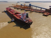 En octubre, los primeros cargamentos ya habían recorrido el ferrocarril Trans-Guinea hasta la costa, y poco después se completó el primer transbordo desde la barcaza autopropulsada “Winning Simandou 1” hacia un Newcastlemax fondeado offshore.