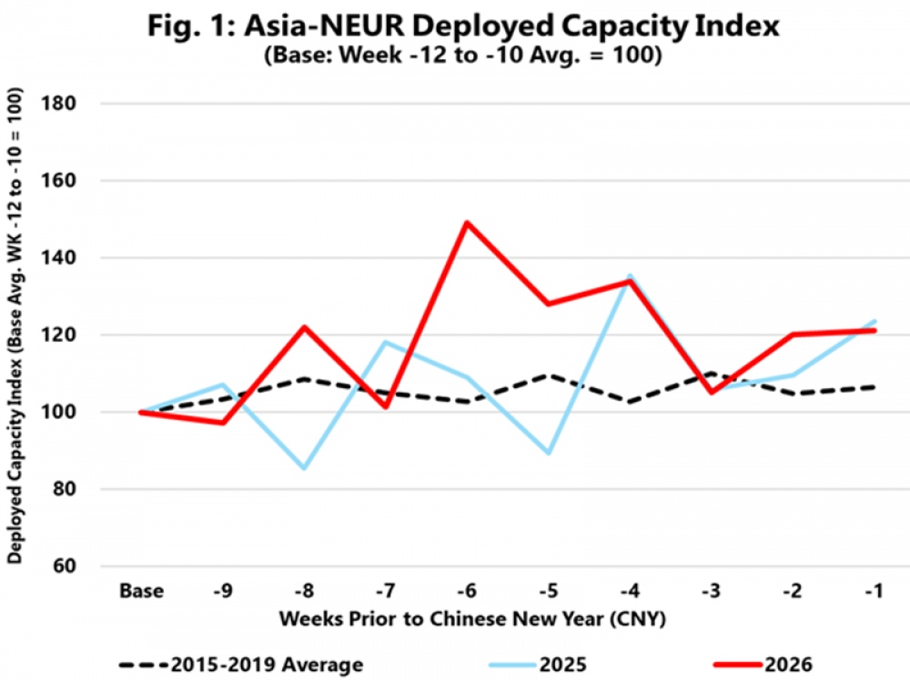 El comportamiento de la capacidad desplegada en las principales rutas marítimas en las semanas previas al Año Nuevo Lunar 2026 está rompiendo con los patrones históricos. De acuerdo con el más reciente análisis de Sea-Intelligence, los dueños de carga han adoptado una estrategia de adelanto masivo de embarques (front-loading), especialmente en la ruta Asia–Norte de Europa (en la imagen), con el objetivo de mitigar el impacto de los prolongados tiempos de tránsito y asegurar disponibilidad de inventarios antes del tradicional retiro de capacidad posterior a la festividad.