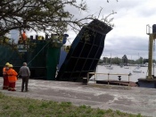 El buque utilizado en esta prueba fue el “Intrépido” de bandera paraguaya de 94 metros de eslora, 10 metros de manga y 5 metros de calado máximo, el cual atracó de popa bajando su rampa sobre la rampa fija conexa a muro, del cual se descargaron vehículos sobre ruedas, contenedores sobre plataformas rodantes y maquinaria.
