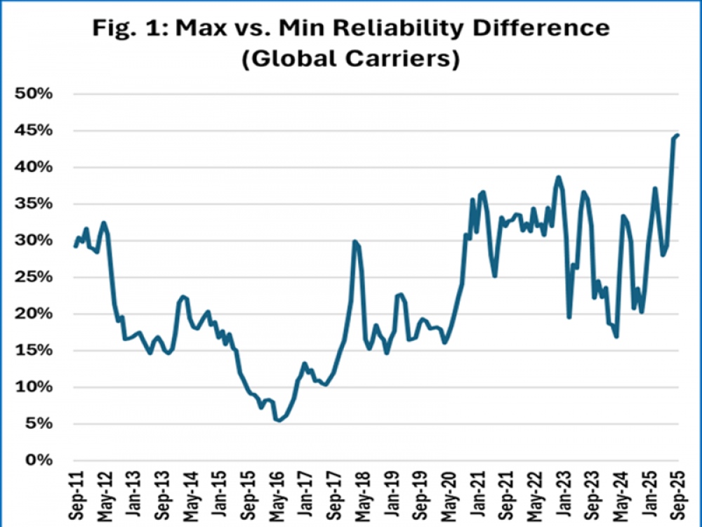 Según Sea-Intelligence, esta expansión sostenida de la dispersión en el desempeño implica que los propietarios de carga enfrentan hoy “un espectro mucho más amplio de niveles de confiabilidad entre las principales líneas navieras” que en el periodo previo a la pandemia.
