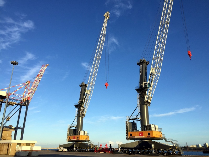 Las dos modernas y altamente eficientes grúas portuarias móviles de Liebherr, tipo LHM 600, son multipropósito, pueden levantar hasta 104 toneladas y están diseñados para un manejo de carga versátil y eficiente.