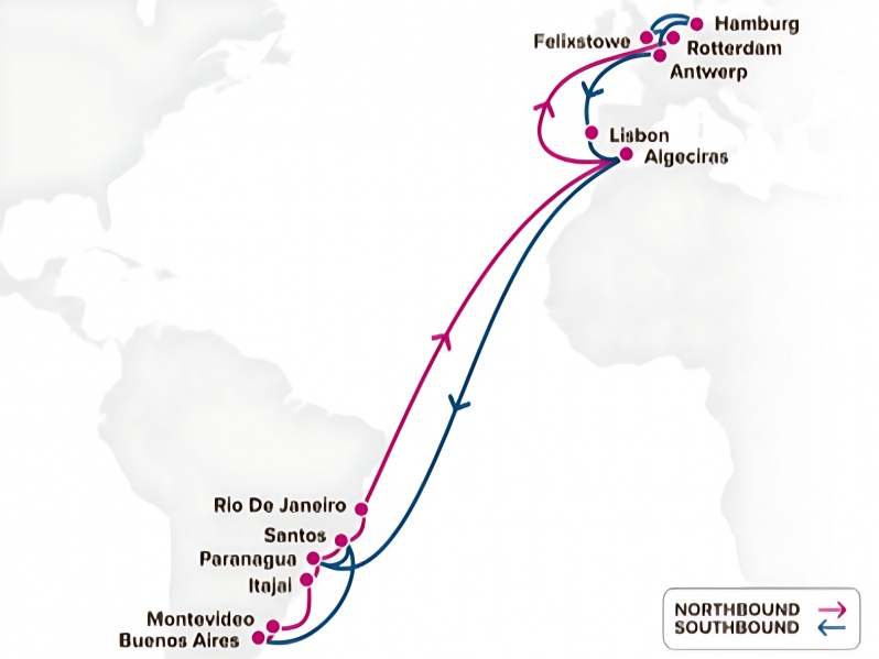 Con el nuevo itinerario, el servicio incluye arribos en: Róterdam – Felixstowe – Hamburg – Amberes – Lisboa – Algeciras – Paranaguá – Santos – Buenos Aires – Montevideo – Itajaí – Paranaguá – Santos – Río de Janeiro – Algeciras – Róterdam.