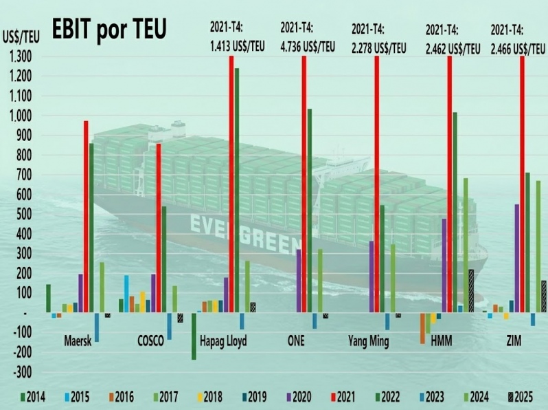 El resto de las líneas navieras reportó pérdidas operativas por cada contenedor movilizado. Cosco presentó el peor desempeño con un EBIT de US$-47/TEU, mientras que ONE (-US$26/TEU), Maersk (-US$23/TEU) y Yang Ming (-US$21/TEU) mostraron resultados negativos similares, evidenciando una convergencia en la falta de rentabilidad unitaria.
