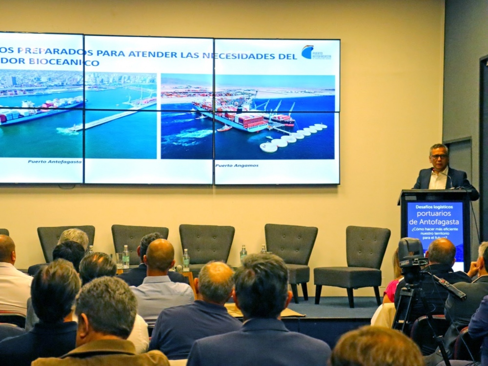 Durante su exposición, el gerente general abordó la logística portuaria de Puerto Antofagasta y su conexión estratégica con las industrias mineras, del litio, del hidrógeno verde, las cargas de proyecto y el comercio exterior, destacando el rol esencial que cumple la logística para el desarrollo de la ciudad, la región, el país y el Corredor Bioceánico.