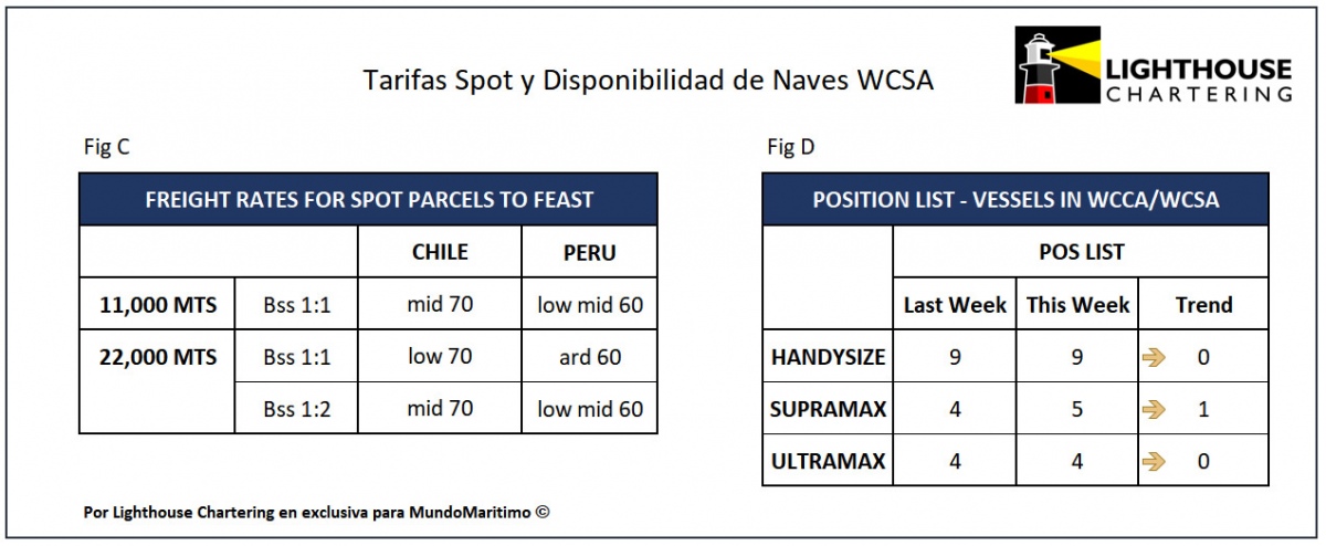 En la ruta Costa Oeste de Sudamérica (Callao)-Norte de Europa (Fig. B) las tarifas de fletamento de los buques Handysize se situaron en US$28.000, equivalente a n 95% de la tarifa de referencia del BHS, manteniendo el valor respecto a la semana anterior. Las naves Supramax alcanzaron tarifas de US$32.000, equivalente a un 107% del segmento de referencia del BSI, conservando el valor de la semana anteriorr.