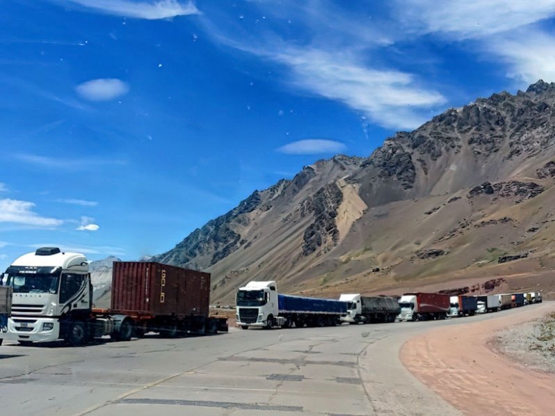 Una extensa fila de camiones varados en el cruce fronterizo del Paso Internacional Cristo Redentor-Libertadores, que conecta Argentina con Chile, ha provocado el control sanitario de Chile, que exige un testeo del 100% a los transportistas terrestres de carga que ingresan al país.